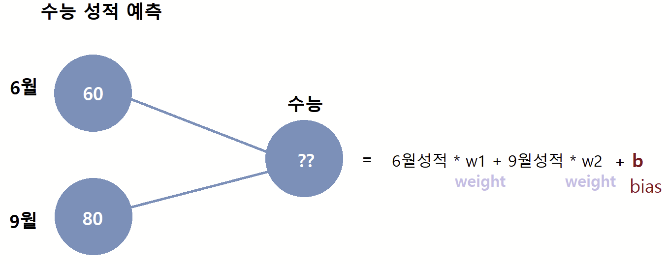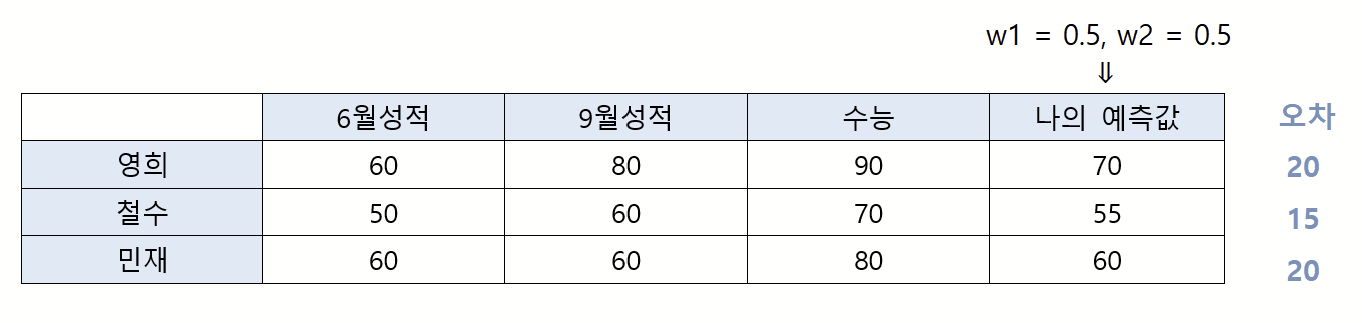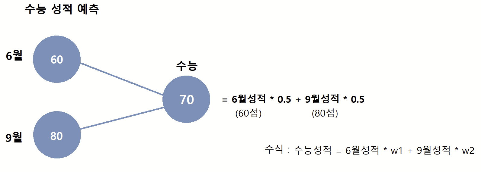 이 매개변수 w의 정확한 명칭은 weight 로 가중치를 뜻한다. "6월 성적과 9월 성적이 어느정도의 가중치를 가지고 있는가?" 를 표현하기 위한 미지수이다. 즉, 위에서처럼 0.5의 가중치를 줬다면 6월 성적이 수능 성적에 50%의 영향력을 끼친다는 뜻