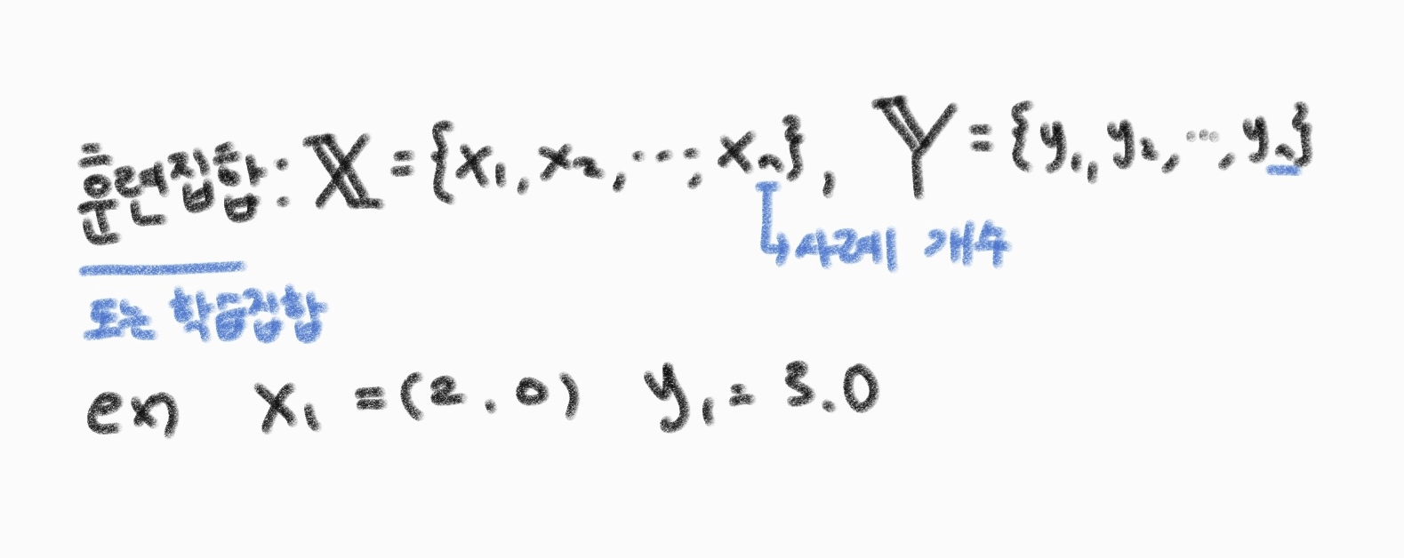 기계학습에선 가로축에 해당하는 패턴을 특징(Feature)이라 한다. 위 예시에서는 특징이 하나뿐이나 보통 2개 이상의 특징으로 구성되는 특징벡터 형태를 띠므로 특징은 스칼라가 아닌 벡터 표기를 사용해야 한다. 따라서 훈련집합(Training Set)는 아래 처럼 표기하며 훈련집한의 요소를 사례 또는 샘플이라 부른다.