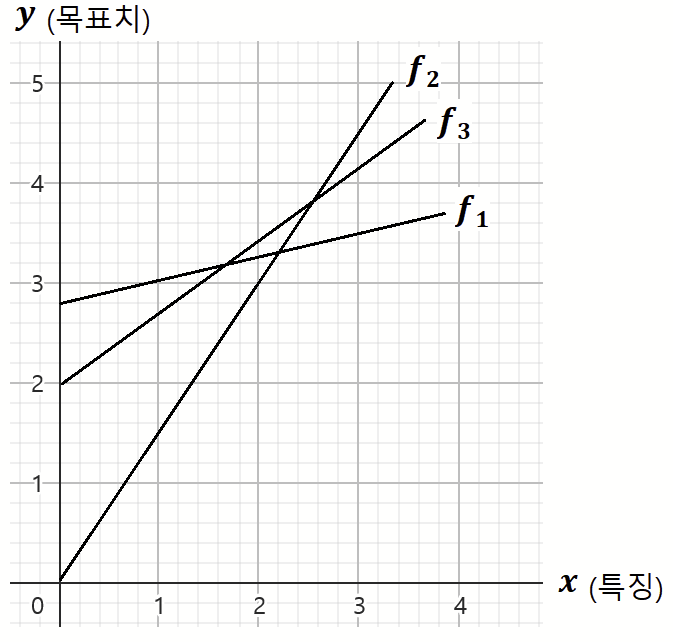 위의 예시는 직선이므로 y = wx + b 와 같이 2개의 매개변수를 가진 식으로 표현할 수 있다. 기계학습이란 가장 정확히 예측할 수 있는, 최적의 매개변숫값을 찾는 작업이다. 이 문제에선 w = 0.5, b =2.0 이 최적의 매개변수로 그래프속 f3이 해당된다.