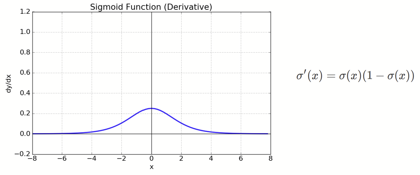 - 도함수가 sigmoid함수가 되기 때문에 기울기가 0~1 사이의 값을 갖는다.