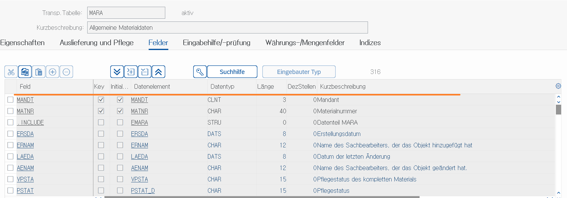 - SE11, SE80 또는 SE16과 같은 관련된 트랜잭션 코드를 사용하여 SAP의 MARA 테이블 및 그 내부 데이터에 대한 추가 정보를 볼 수 있다.