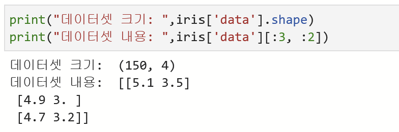 예를 들어, [:3, :2] 로 한다면 3개의 행과 두번째 열까지만을 보겠다는 의미. 2로 지정해줘서 꽃받침(sepal)의 길이와 너비값만 볼 수 있다.