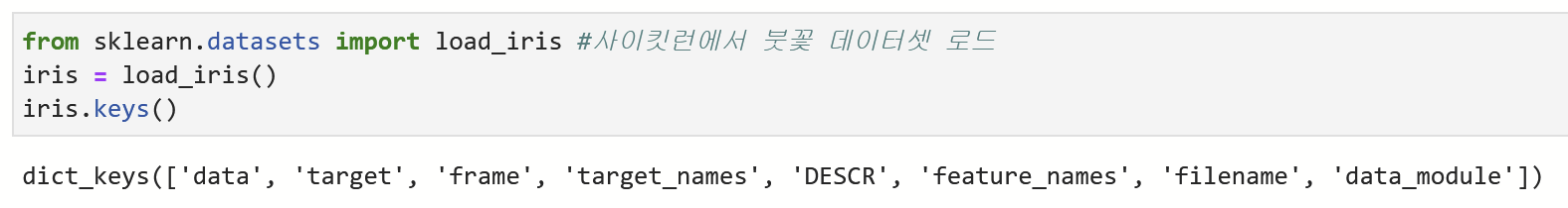 사이키런(Sklearn)에는 머신 러닝을 쉽게 배울 수 있게 샘플 데이터셋들을 가지고 있다. 그 중에 붓꽃(Iris) 데이터셋도 있으니 이를 로드해준다. 붓꽃 데이터셋은 자료형이 딕셔너리(Dictionary)니 먼저 Key 값을 확인해주자.