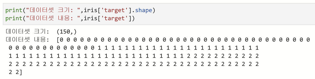 'target' 키를 이용해 목표 변수의 데이터를 확인해보았다. 150개의 샘플 데이터에 대한 레이블(label) 값이 1차원 배열에 들어있음을 확인할 수 있다. 총 3개의 (Setosa[0], Versicolor[1], Virginica[2]) 클래스를 가지고 있다.