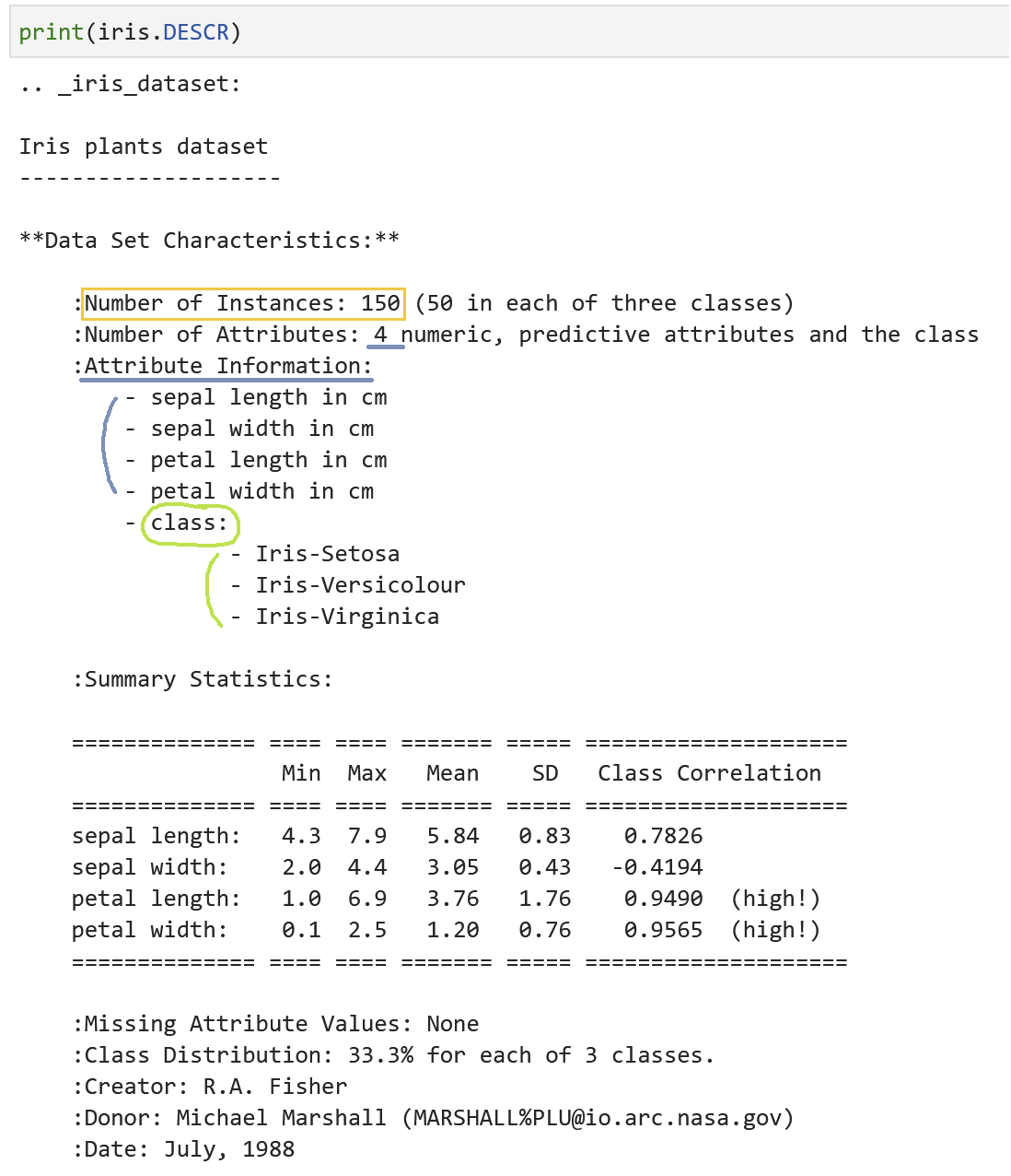 데이터셋에 대해 설명한 위의 정보를 통해, 총 150개의 붓꽃 샘플 데이터가 정리되어 있음과 4개의 피처(feature) [sepal length/width : 꽃받침의 길이/너비, petal length/width : 꽃잎의 길이/너비]값이 들어있음을 알 수 있다. 그리고 Class 에서 setosa, versicolur, virginica 이렇게 3가지의 붓꽃 품종이 있음을 알 수 있다. 따라서, 붓꽃을 3가지의 품종 중에서 하나의 품종으로 분류하는 다중분류 문제다.