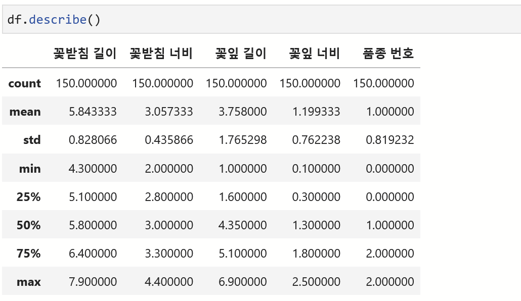 describe()은 150개 샘플의 평균값, 표준편차, 최소값, 최대값 등의 통계 정보를 요약해준다