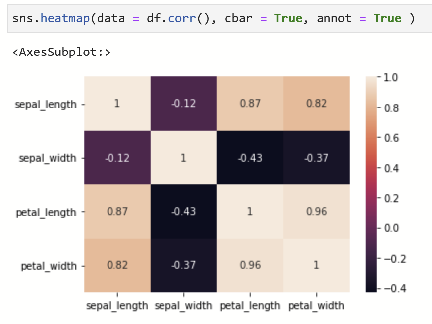 seaborn 의 heatmap()을 이용해 상관 계수 행렬을 히트맵으로 나타냈다. 각 변수 간의 상관계수를 다른 색으로 표현하고 있는데, annnot 옵션을 사용해 상관 계수 숫자까지 표시할지 말지 정할 수 있다. true 일 시 숫자 보이기. cbar 는 그래프 옆에 컬러바를 의미하는데, 위 처럼 보이게 하고 싶으면 true 헤주면 된다.