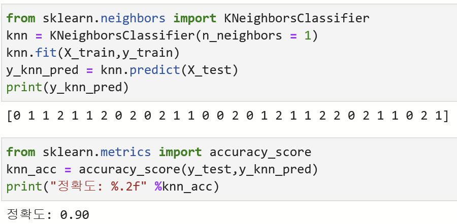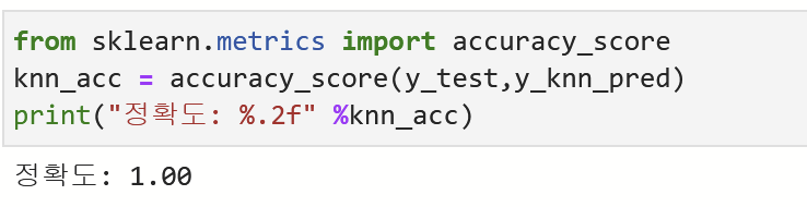X_test의 정답 레이블 y_test를 예측값 y_knn_pred와 함께 입력해서 정확도를 산출했다.