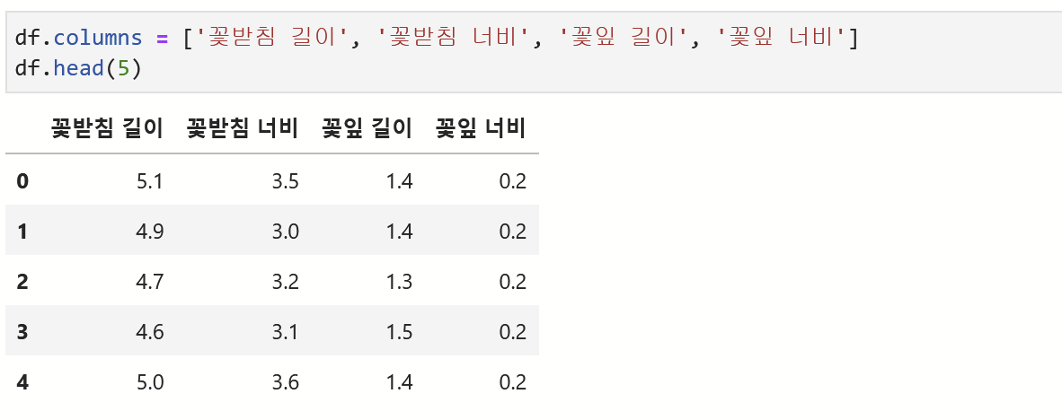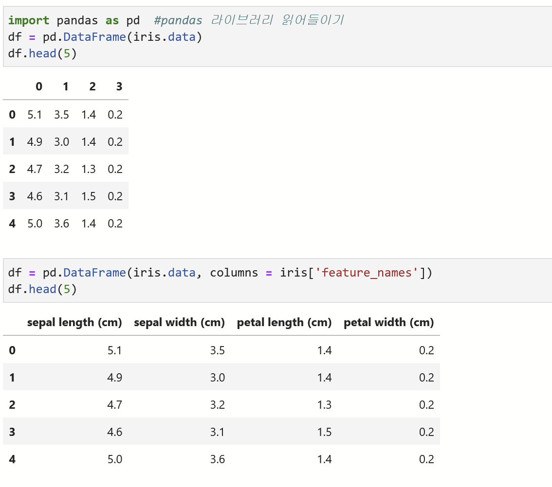 Datframe에 그냥 data라고만 넣으면 위의 처럼 숫자로 나타내지니, columns (칼럼,열) 에 이름을 iris 딕셔너리의 속성feature_names 를 가져와 넣어준다. head(5) 는 숫자 만큼의 행을 추출할 수 있다.