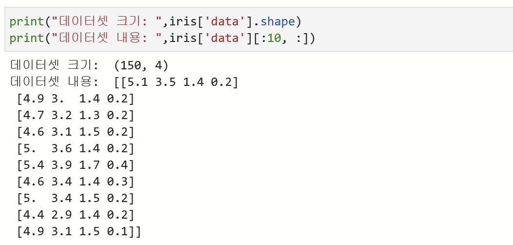 150개의 샘플 데이터를 다 부르기엔 너무 크니 잘라주었다. 위 코드는 10개의 행을 출력한 것이다([0]~[9]). [:행, :열] 을 통해 범위를 지정해 줄 수 있다.