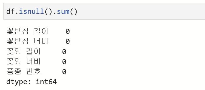 isnull() 에 sum()을 적용해주면, 각 열의 결측값의 총 개수를 계산해준다. 모두 0이니 결측값이 존재하지 않음을 알 수 있다.