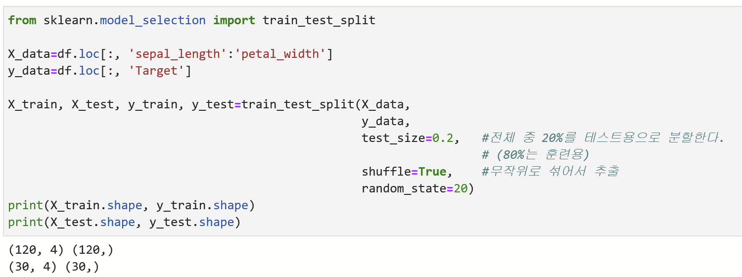모델학습에 사용한 훈련(train) 데이터와 모델성능을 평가하는데 사용돨 테스트(Test) 데이터로 분할한다. (보통 훈련:테스트 = 8: 2 의 비율로 분할한다.) 사이킷런의 train_test_split()을 사용해서 편리하게 나눌 수 있다.