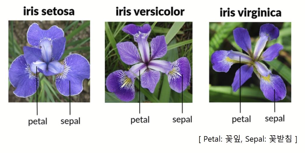 붓꽃(Iris)은 위와 같이 3가지의 종류(Setosa, Versicolor, Virginica)를 가지고 있다.