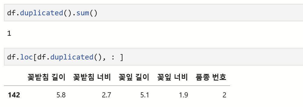 dupicated() 를 통해 중복 데이터를 확인할 수 있는데, 중복되면 true를, 그렇지 않으면 false를 반환한다. sum() 을 적용해 총 몇개의 행이 중복되어 있는지 확인할 수 있다. 현재 1개의 행이 중복되어 있음을 알 수 있다.