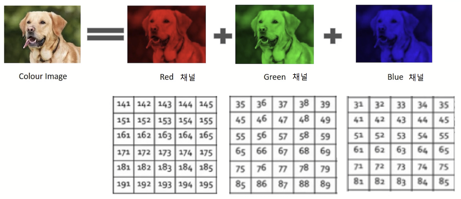 - 칼라 이미지는 3개의 채널을, 흑백 이미지는 하나의 채널만을 가진다.