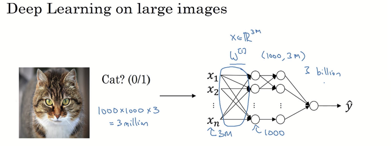 다충 퍼셉트론으로 이미지 인식 문제를 처리해야 한다고 가정해보자. 위의 고양이 이미지의 크기를 1000 x 1000이라 해보자. 추가로 칼라이미지라 채널을 3개를 가지니 해당 이미지의 차원은 1000 x 1000 x 3 으로 총 3백만 개의 픽셀값으로 이루어진 것이다. 따라서 신경망에서 입력층은 총 3백만개의 입력특징을 갖게 된다. 만일 이 신경망에서 첫 은닉층에서 1000개의 은닉노드가 있다면 첫번째 은닉층로 가는 매개변수의 수는 3,000,000 x 1000 = 삼십억개가 된다. 이렇게 변수가 크면 큰 만큼의 충분한 데이터를 얻어서 과적합을 방지하기가 어려워진다. 또한 메모리의 요구사항이 몇 십억개의 변수를 학습하기에는 적합하지 않을 수도 있다.