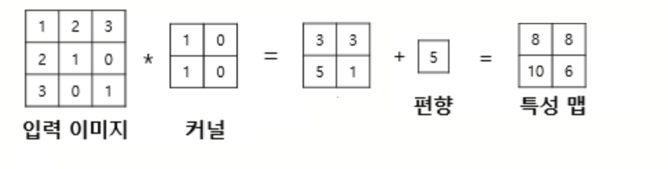 합성곱 신경망에도 편향(bias)를 추가할 수 있다. 필터가 적용된 뒤에 편향이 추가된다. 편향은 하나의 값만 존재하며, 커널이 적용된 결과의 모든 원소에 더해진다.