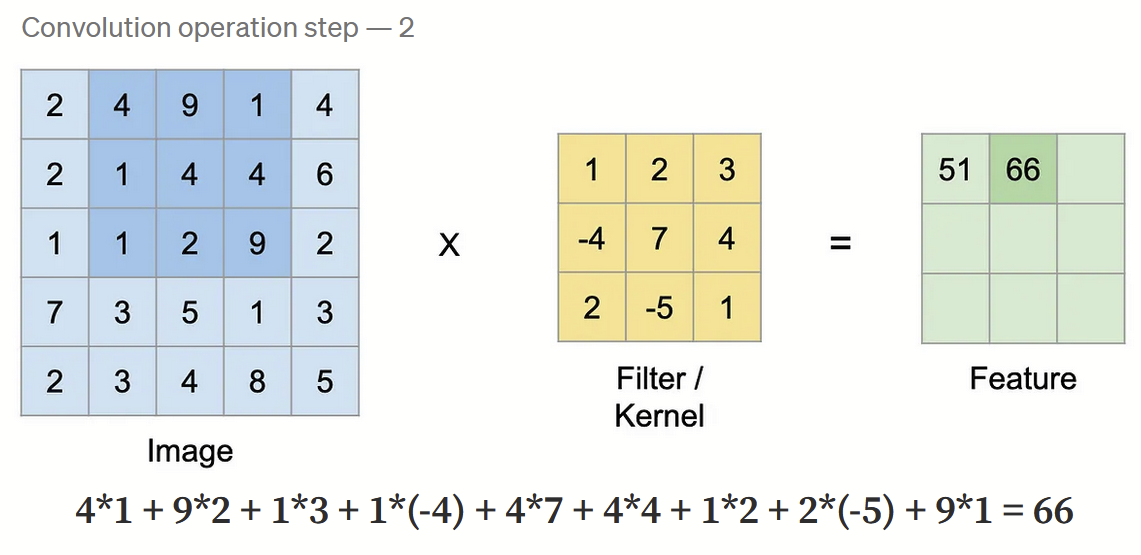 합성곱은 필터(Filter) 또는 커널(Kernel) 이라 불리는 행렬로 이미지를 처음부터 끝까지 겹치며 훑으면서 필터와 겹쳐지는 부분의 원소끼리 값을 곱해서 모두 더한 값을 출력으로 한다. 이때 이미지는 가장 왼쪽 위부터 가장 오른쪽 아래까지 순차적으로 훑게 된다.