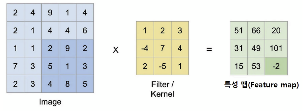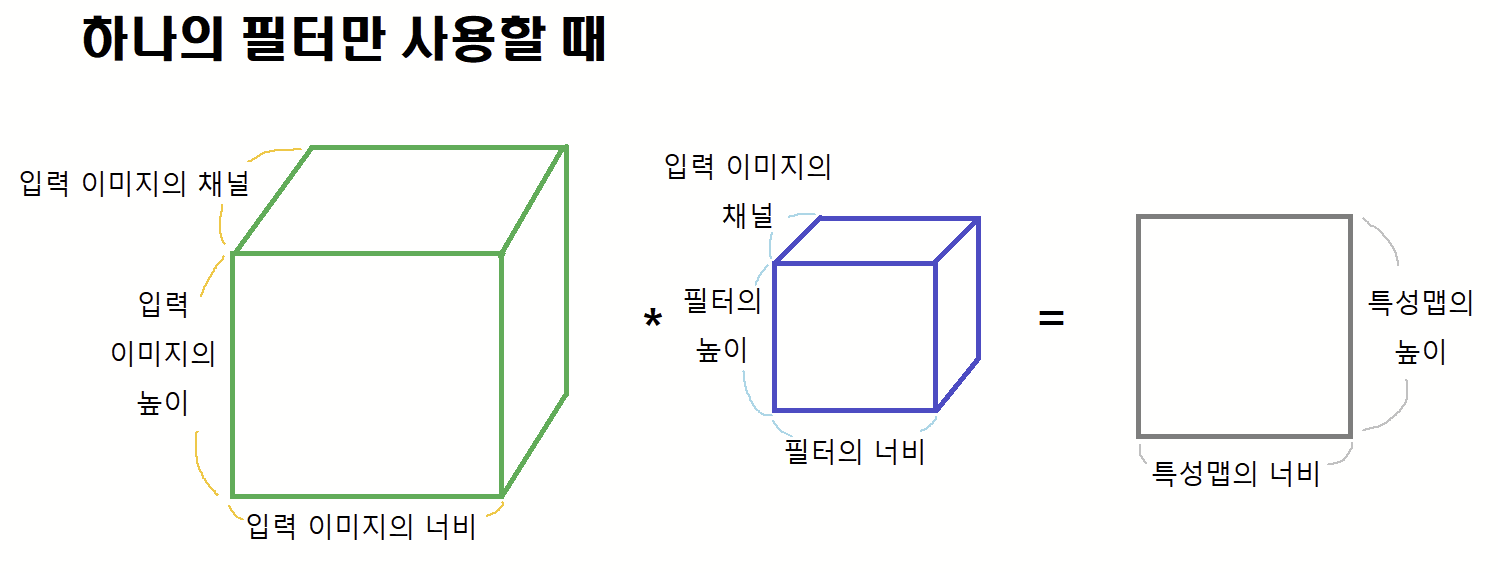 하나의 필터만 사용할 경우 3차원 텐서를 가진 입력 이미지의 합성곱 연산의 결과는 2차원의 특성맵이 된다.