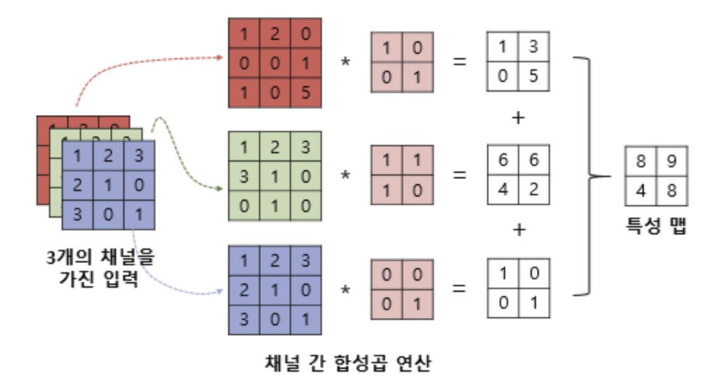 지금까지는 위의 예시처럼 채널을 고려하지 않고 합성곱 연산을 했었는데, 실제 합성곱 연산의 입력이미지는 다수의 채널을 가지고 있거나 또는 이전 연산의 결과로 나온 특성 맵일 수도 있다.