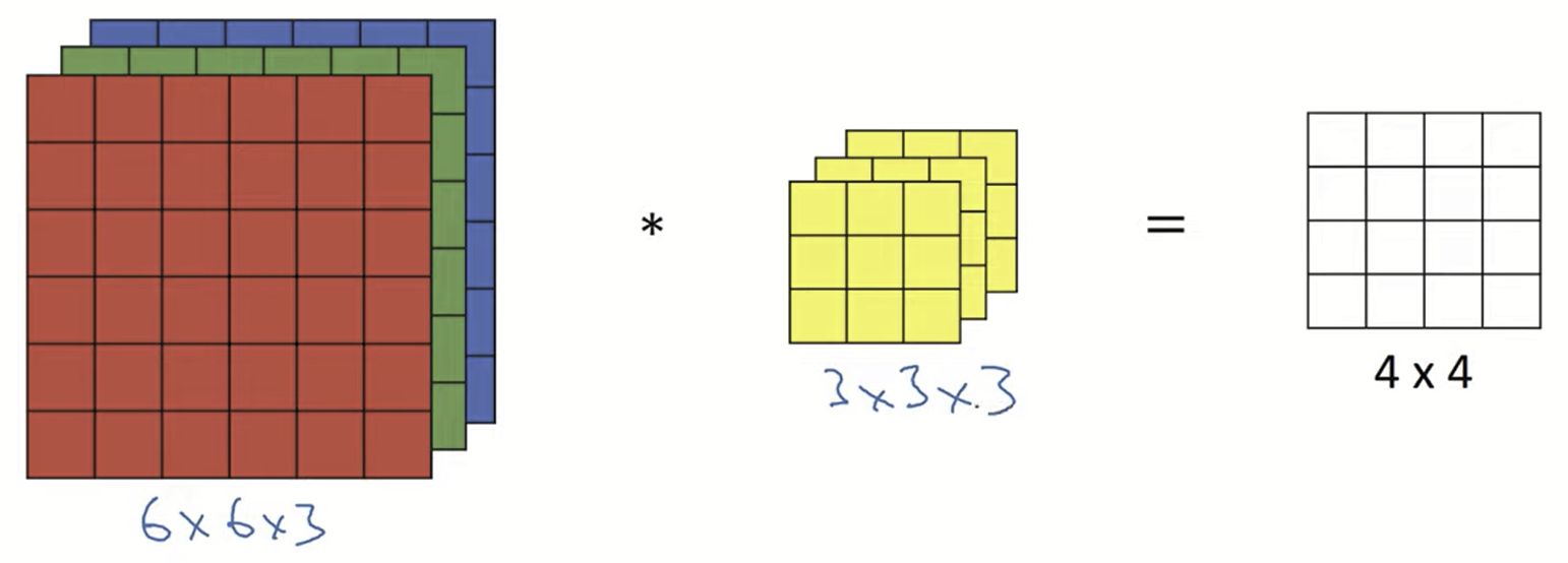 따라서 위의 6 x 6 x 3 입력 이미지와 두 개의 3 x 3 x 3 필터의 결과는 4 x 4 x 2의 크기를 가진다.