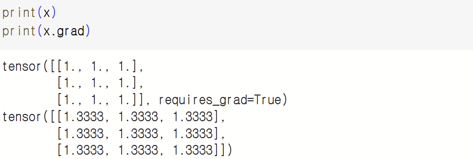 grad: 현재 텐서에 들어있는 data가 계속 거쳐온 layer에 대한 미분값 저장시킨다.
