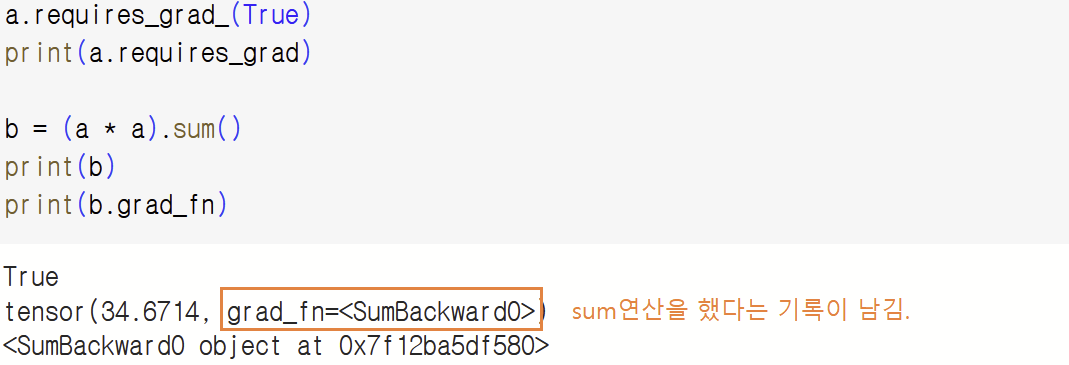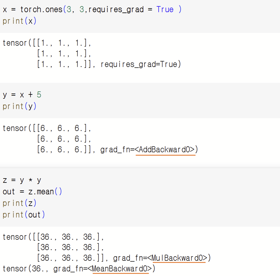grad_fn: 미분값을 계산한 함수에 대한 정보 저장 (어떤 함수에 대해서 backprop 했는지)